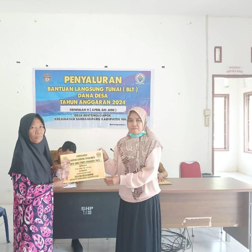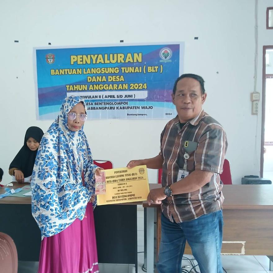Benteng Lompoe - pada Jumat (06/05/2024) Pemerintah Desa Benteng Lompoe, Kecamatan Sabbangparu, Kabupaten Wajo melaksanakan Penyaluran Bantuan Langsung Tunai (BLT) Dana Desa Triwulan II Tahun 2024, yang meliputi bulan April, Mei, dan Juni, bertempat di Aula Kantor Desa Benteng Lompoe.