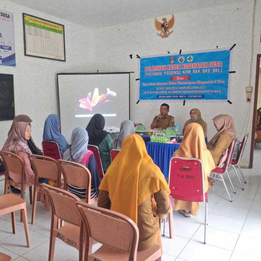 Benteng Lompoe – Rabu (15/10/2025) Pemerintah Desa Benteng Lompoe menggelar Pelatihan Kader Kesehatan Desa Tahun Anggaran 2025 selama dua hari, mulai Selasa hingga Rabu (14–15 Oktober 2025), bertempat di Kantor Desa Benteng Lompoe, Kecamatan Sabbangparu, Kabupaten Wajo.