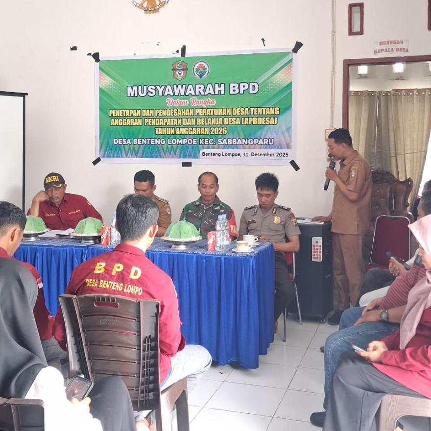 Benteng Lompoe – Badan Permusyawaratan Desa (BPD) Desa Benteng Lompoe menggelar musyawarah dalam rangka pengesahan Peraturan Desa tentang Anggaran Pendapatan dan Belanja Desa (APBDesa), yang dilaksanakan di Aula Kantor Desa Benteng Lompoe, Selasa, 30 Desember 2025.
